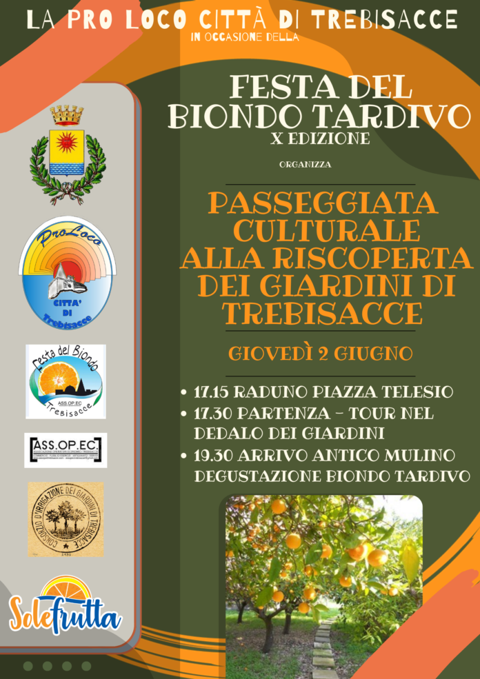 n occasione della decima edizione della Festa del Biondo Tardivo di Trebisacce, la Pro Loco Città di Trebisacce, partner dell’evento, rinnova l’appuntamento della passeggiata culturale nel dedalo dei Giardini di Trebisacce, luogo natio dell’arancia autoctona.