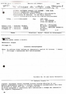 Portata d’urgenza il giorno 22 novembre scorso con l’improvvisa paralisi del lato destro del corpo, la mancanza di parola e la rigidità del collo presso l’ospedale di Portoferraio, viene ricoverata nel reparto di Medicina terapia intensiva. I medici oltre all’ipotesi di ictus sospettano una infezione e il giorno seguente 23 novembre mandano al Laboratorio Analisi un campione di sangue per l’emocoltura , esame che impiega 4/5 giorni a produrre il suo risultato.