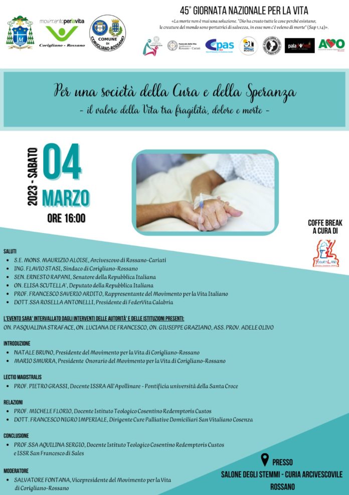 Dopo gli indirizzi di saluto di Bruno e del Presidente onorario Mario Smurra, la Lectio Magistralis del professore Pietro Grassi sarà anticipata dagli interventi di S.E. Mons. Maurizio Aloise, arcivescovo di Rossano – Cariati, del Sindaco Flavio Stasi, del senatore Ernesto Rapani, del deputato Elisa Scutellà , del rappresentante del Movimento per la Vita Francesco Saverio Ardito, presidente di Federvita Calabria Rossella Antonelli. Seguiranno le relazioni di Michele Florio, docente dell’istituto teologico cosentino Redemptoris Custos e Francesco Nigro Imperiale, dirigente cure palliative domiciliari san Vitaliano Cosenza.