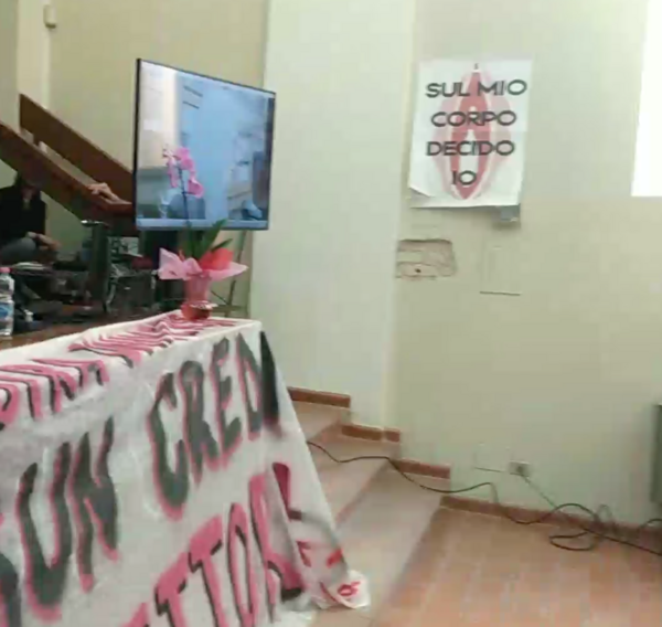 «Decine di femministe hanno occupato la Biblioteca Statale di Macerata per impedire lo svolgimento del Convegno “Maternità In-Attesa. Preservare la salute della donna in gravidanza” organizzato da Pro Vita & Famiglia Onlus con la Regione Marche, il Centro di Aiuto alla Vita di Loreto e la Federazione Consultori Familiari di Ispirazione Cristiana Regione Marche e dall’OPA – Osservatorio Permanente sull’Aborto. Le femministe hanno urlato a chiunque si avvicinasse al tavolo dei relatori per parlare ai microfoni. In più hanno affisso volantini e striscioni contro il convegno e con espliciti riferimenti sessuali e occupato quasi tutte le sedie della sala. Il nostro scopo è difendere il diritto alla salute delle donne e il loro diritto anche a NON abortire. Ma loro lo volevano impedire. E’ questa la libertà che professano? Sono questi i diritti e la democrazia di cui si ergono a paladine? Soltanto l’intervento della Digos ha permesso, seppur in estremo ritardo, l’avvio del convegno. Nel lasciare la sala hanno rovesciato le sedie e sparato coriandoli lasciando sporcizia a terra. Inoltre molte persone interessate al dibattito sono comprensibilmente andate via, spaventate dal clima di odio e di violenza». Così Francesca Romana Poleggi, membro del Direttivo di Pro Vita & Famiglia Onlus.