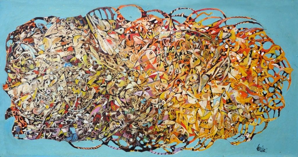 Ogni opera rappresenta un racconto, un’esperienza intensa di cose vissute, raccontate attraverso il concatenarsi di forme, colori, vortici di immagini e figure che si intersecano in un magma vivo e brulicante di emozioni.