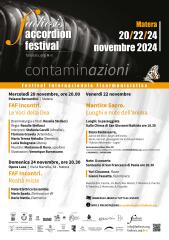 La rassegna 2024, dal tema Contamiazioni, propone due appuntamenti realizzati in collaborazione il 20 novembre con Maté Solisti Lucani e il 24 novembre con MaterElettrica Ensemble. Venerdì 22 novembre il gradito ritorno del Maestro Gianni Fassetta alla fisarmonica che, in duo con il flautista Yuri Ciccarese, si esibirà al Santuario di San Francesco da Paola.