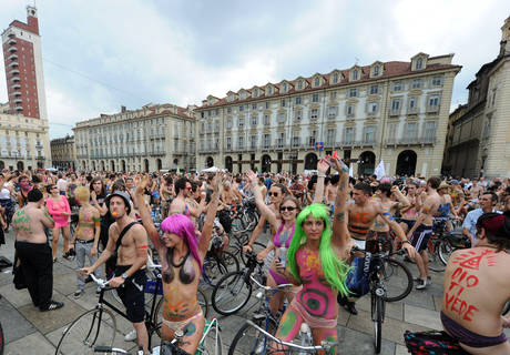 Seminudi in sella alle bici, a centinaia hanno attraversato oggi il centro di Torino nella giornata mondiale del ‘World Nake Bike Pride’, promossa in molte cita’ per protestare contro la dipendenza dal petrolio. I ciclonudisti si erano dati appuntamento nel primo pomeriggio al parco del Valentino e dopo le 17 sono passati in via Roma, tra la curiosita’ dei passanti che si sono fermati a osservare il gruppo. Quasi tutti i ciclonudisti erano in costume da bagno o in pantaloncini e avevano coperte le parti intime,