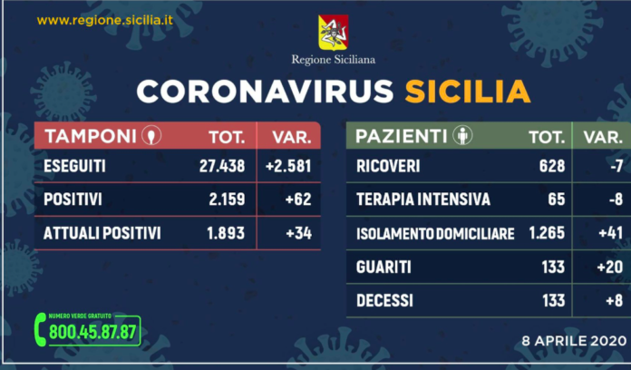 Questo il quadro riepilogativo della situazione in Sicilia, aggiornato alle ore 17 di oggi (mercoledì 8 aprile), in merito all’emergenza Coronavirus, così come comunicato dalla Regione Siciliana all’Unità di crisi nazionale.