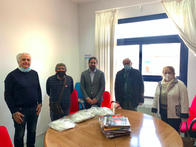 La consegna delle mascherine FFP2 donate dall’Ortofrutticola Messinese, tramite il Kiwanis Zancle e la prof.ssa Rossella Musolino, da sx. il dott. Antonino Levita, Salvatore Vecchio, il dott. Giuseppe Laganga, l’avv. Nino Dalmazio e la prof.ssa Rossella Musolino.