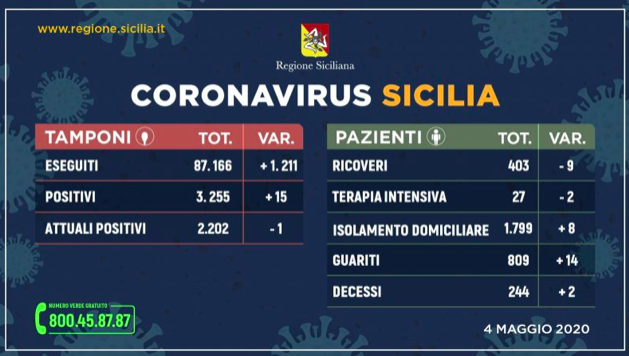 Ottime notizie oggi in Sicilia. Su 1211 tamponi il 98,8% è negativo e oggi si registrano solo 15 nuovi casi. È il dato più basso dallo scorso 13 marzo, quando l’epidemia era ancora all’inizio. Ecco il quadro riepilogativo della situazione in Sicilia, aggiornato alle ore 16 di oggi (lunedì 4 maggio), in merito all’emergenza Coronavirus, così come comunicato dalla Regione Siciliana all’Unità di crisi nazionale: dall’inizio dei controlli, i tamponi effettuati sono stati 87.166 (+1.211 rispetto a ieri), su 79.336 persone: di queste sono risultate positive 3.255 (+15), mentre attualmente sono ancora contagiate 2.202 (-1), 809 sono guarite (+14) e 244 decedute (+2). Degli attuali 2.202 positivi, 403 pazienti (-9) sono ricoverati, di cui 27 in terapia intensiva (-2), mentre 1.799 (+8) sono in isolamento domiciliare.