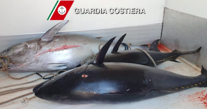 di tonno rosso “Thunnus thinnus”, per un peso complessivo di circa 225 kg, con l’ausilio del battello GC A 64 per sbarcarli all’interno del porto di Milazzo.