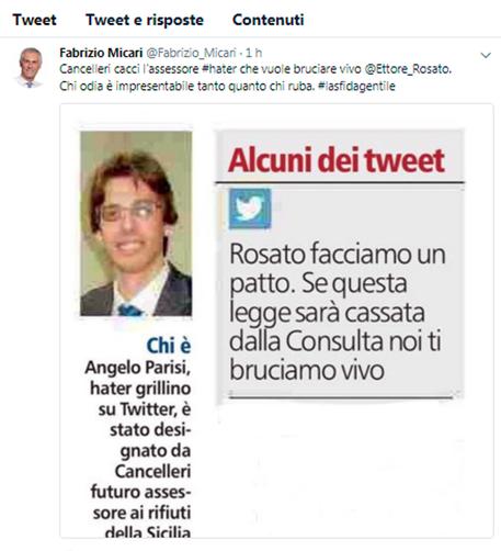 Il tweet con cui il candidato candidato presidente della Regione siciliana del centrosinistra Fabrizio Micari denuncia l'attacco del futuro assessore del M5S, Angelo Parisi, indicato nella squadra di governo da Giancarlo Cancelleri, che sempre su Twitter ha scritto: ''Rosato facciamo un patto, se questa legge sarà cassata dalla Consulta, noi ti bruceremo vivo, ok?". Palermo, 31 ottobre 2017. +++ATTENZIONE LA FOTO NON PUO? ESSERE PUBBLICATA O RIPRODOTTA SENZA L?AUTORIZZAZIONE DELLA FONTE DI ORIGINE CUI SI RINVIA+++
