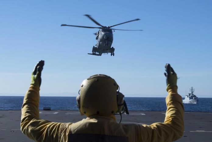 L'arrivo dell'elicottero con il presidente del Consiglio Paolo Gentiloni a bordo della nave Etna, che opera nell'ambito della missione Sophia nella acque del Mediterraneo. Roma, 24 dicembre 2017. ANSA/ UFFICIO STAMPA PALAZZO CHIGI-TIBERIO BARCHIELLI +++ ANSA PROVIDES ACCESS TO THIS HANDOUT PHOTO TO BE USED SOLELY TO ILLUSTRATE NEWS REPORTING OR COMMENTARY ON THE FACTS OR EVENTS DEPICTED IN THIS IMAGE; NO ARCHIVING; NO LICENSING +++