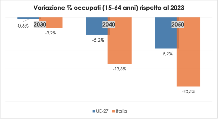 Se si estende la proiezione sul 2040 e poi sul 2050, la situazione peggiora drasticamente, con l’andamento italiano sempre più critico rispetto alla media europea. Già nel 2040, fra meno di vent’anni, il calo di occupati in Italia arriverebbe al 13,8% e al 20,5% nel 2050. Tradotto in numeri assoluti, nel 2040 si stima ci saranno 3,1 milioni di lavoratori in meno e nel 2050 il calo arriverebbe a 4,6 milioni.
