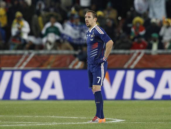 epa02207886 French Franck Ribery looks on after Mexico scored the 1-0 lead during the FIFA World Cup 2010 group A preliminary round match between France and Mexico at the Peter Mokaba stadium in Polokwane, South Africa, 17 June 2010. EPA/JONATHAN BRADY Please refer to www.epa.eu/downloads/FIFA-WorldCup2010-Terms-and-Conditions.pdf