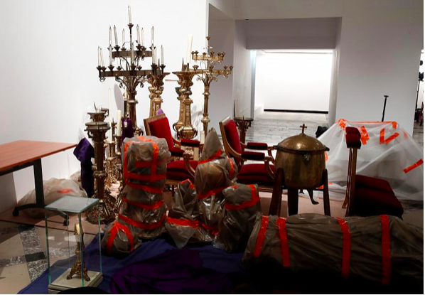 Nelle foto Reuters dalla marie di Parigi si vedono i set d’altare che comprendono croci, candelabri e delle poltrone.