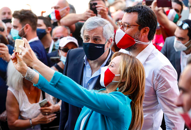 Ressa di cameraman, fotografi e cronisti all’imbocco di via del Corso, davanti al tricolore lungo 500 metri esposto nella manifestazione del centrodestra a Roma. L’ultimo ad arrivare è Matteo Salvini. Insieme a lui Giorgia Meloni e Antonio Tajani.