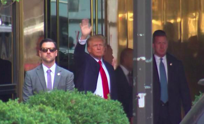Indossando il suo caratteristico abito scuro con la cravatta rossa, Trump si è voltato e ha salutato la folla fuori dall’edificio prima di entrare, lasciare le sue impronte digitali e andare a processo. È arrivato in tribunale con un corteo di otto auto dalla Trump Tower, mostrando una certa frustrazione sulla sua piattaforma Truth Social.