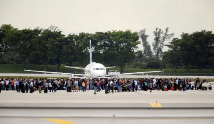 People stand on the tarmac at the Fort Lauderdale-Hollywood International Airport after a shooter opened fire inside a terminal of the airport, killing several people and wounding others before being taken into custody, Friday, Jan. 6, 2017, in Fort Lauderdale, Fla. (Al Diaz /Miami Herald via AP) [CopyrightNotice: MIAMI HERALD]