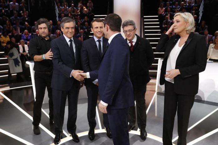 epa05860681 French left-wing French Socialist (PS) party candidate Benoit Hamon (3-R) stands in front of right-wing 'Les Republicains' (LR) candidate Francois Fillon (L), 'En Marche!' movement candidate Emmanuel Macron (C), far-left coalition 'La France insoumise' Jean-Luc Melenchon (2-R) and far-right Front National (FN) party leader Marine Le Pen (R) prior to the start of a debate of candidates organised by French private TV channel TF1 in Aubervilliers, outside Paris, France, 20 March 2017. French presidential elections are planned for 23 April and 07 May 2017. Others are not identified. EPA/PATRICK KOVARIK / POOL MAXPPP OUT