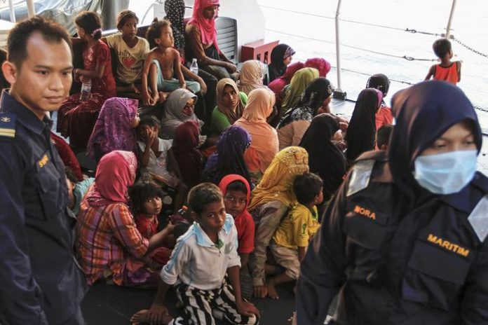epa06643206 Malaysian Maritime Enforcement Agency (MMEA) officers watch over Myanmar ethnic Rohingya Muslims, who were intercepted while travelling on a boat, as they are escorted at Kuala Kedah Jetty, in Kedah State, Malaysia, 03 April 2018. According to reports, Malaysian authorities intercepted on the day a boat carrying 56 Rohingya refugees; 19 men, 17 women, and 20 children; near Nyior Setali Island, off the island of Langkawi. The boat was said to have previously stopped at an island in southern Thailand on 01 April, with Thai authorities reportedly saying it was heading to Malaysia. EPA/STRINGER MALAYSIA OUT