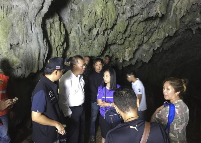 In this Saturday, June 23, 2018, photo, the Governor of Chiang Rai Narongsak Osatanakorn talk to his staff in the entrance of the cave where a groupof boys went missing in Chiang Rai, Thailand. Officials say multiple attempts to locate the 12 boys and their soccer coach missing in a flooded cave in northern Thailand for nearly two days have failed, but that they will keep trying. (Chiang Rai City Public Affairs Department via AP) [CopyrightNotice: Copyright 2018 The Associated Press. All rights reserved]