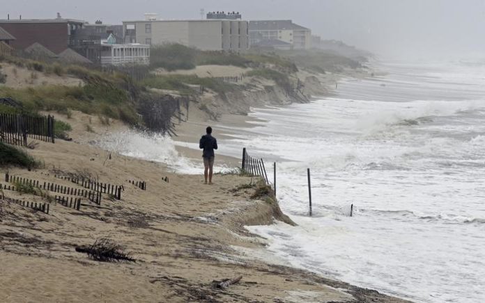 Heavy surf crashes the dunes at high tide in Nags Head, N.C., Thursday, Sept. 13, 2018 as Hurricane Florence approaches the east coast. (ANSA/AP Photo/Gerry Broome) [CopyrightNotice: Copyright 2018 The Associated Press. All rights reserved]