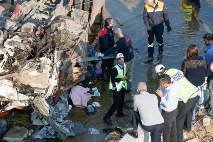 epa07092114 Search and rescue teams work at the site of a bus accident, which was carrying migrants to Greece's Samos Islands, in Izmir, Turkey, 14 October 2018. According to reports 19 people died and 12 people were injured.