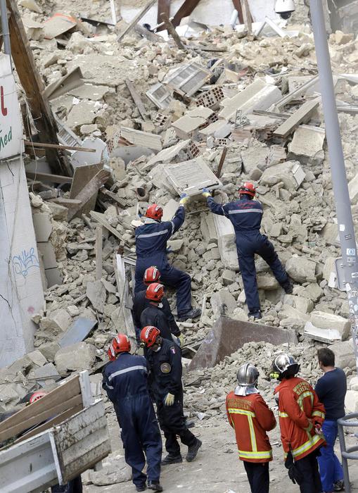 Firefighters work at the scene where a building collapsed in Marseille, southern France, Monday, Nov. 5, 2018. Two buildings collapsed in the southern city of Marseille on Monday, leaving a giant pile of rubble and beams. Fire services said two people were lightly hurt. The collapse spewed debris into the street and clouds of dust into the air, and left a big gap where the two buildings used to be. (ANSA/AP Photo/Claude Paris) [CopyrightNotice: Copyright 2018 The Associated Press. All rights reserved.]