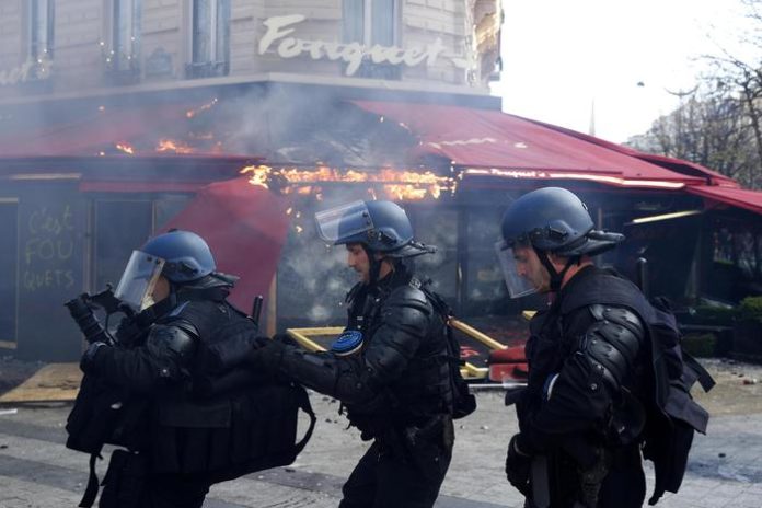 epa07442845 Riot police try to secure a perimeter in front of the Fouquet's restaurant on fire during the 'Act XVIII' demonstration (the 18th consecutive national protest on a Saturday) in Paris, France, 16 March 2019. The so-called 'gilets jaunes' (yellow vests) is a grassroots protest movement with supporters from a wide span of the political spectrum, that originally started with protest across the nation in late 2018 against high fuel prices. The movement in the meantime also protests the French government's tax reforms, the increasing costs of living and some even call for the resignation of French President Emmanuel Macron. EPA/YOAN VALAT