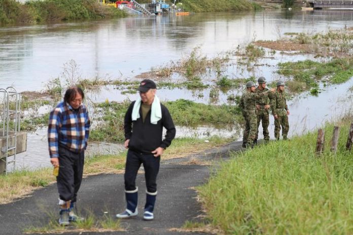 epa07950084 A river is flooded by torrential rain in Sakura, Chiba Prefecture, southeast of Tokyo, Japan, 26 October 2019. Torrential rain on 25 October caused floods and landslides, leaving eight people dead and two others missing. The areas are still recovering from damage done by Typhoon Hagibis earlier this month. EPA/JIJI JAPAN OUT EDITORIAL USE ONLY/ NO ARCHIVES