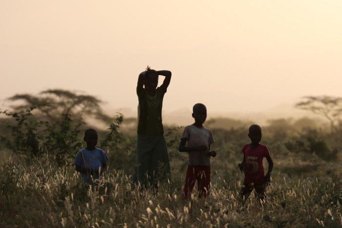 epa08137540 Kids from Tungai Manyatta village which was also invaded by desert locust are silhouetted after an invasion in Shaba National Reserve in Isiolo, northern Kenya, 16 January 2020 (issued XX January 2020). Large swarms of desert locusts have been invading northern Kenya for weeks, after having infested some 70,000 hectares of land in Somalia which the United Nations Food and Agriculture Organisation (FAO) has termed the 'worst situation in 25 years' in the Horn of Africa. FAO cautioned on 13 January 2020 that it poses an 'unprecedented threat' to food security and livelihoods in the region. The government is spraying pesticide in the affected areas to battle the insects. EPA/Daniel Irungu