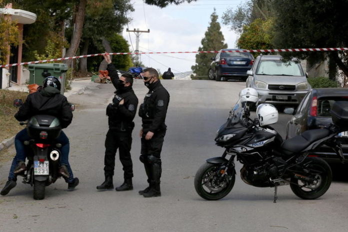 epa09124426 Police officers cordon the area outside the home of Greek journalist Giorgos Karaivaz after he was murdered in Alimos, on the southern coast of Attica, Greece, 09 April 2021. Witnesses reported two men on a motorbike, possibly a scooter, outside his home, fired multiple shots at the victim with a handgun, inflicting fatal injuries. The culprits then took off in an unknown direction. Police are now conducting an investigation and the area has been cordoned off. According to a police source, the journalist had not reported any threats against him nor asked for police protection. EPA/ORESTIS PANAGIOTOU