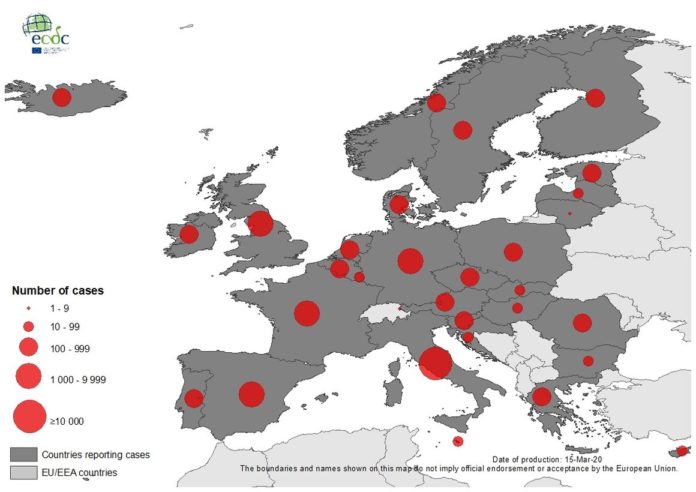 Londra – Al 15 marzo 2020, 39 768 casi sono stati segnalati nell’UE / SEE e nel Regno Unito: Italia (17 750), Spagna (5 753), Francia (4 499), Germania (3 795), Regno Unito (1 140 ), Paesi Bassi (959), Svezia (924), Norvegia (907), Danimarca (827), Belgio (689), Austria (655), Grecia (228), Repubblica Ceca (214), Finlandia (210), Slovenia ( 181), Portogallo (169), Islanda (138), Irlanda (129), Estonia (115), Romania (113), Polonia (104), Slovacchia (44), Bulgaria (41), Lussemburgo (38), Croazia ( 37), Ungheria (31), Lettonia (26), Cipro (21), Malta (18), Lituania (9) e Liechtenstein (4).