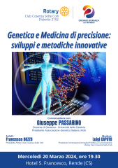 L’evoluzione umana viaggia di pari passo con i progressi scientifici. I passi da gigante compiuti dalla Medicina nel corso dei secoli hanno portato a migliorare notevolmente le condizioni di vita di uomini e donne. Negli ultimi tempi, grazie al contributo della Genetica, si è sviluppata la Medicina di precisione che, sfruttando il sequenziamento del genoma umano e l’applicazione delle moderne tecnologie, permette di ottenere, per ogni paziente, informazioni specifiche che favoriscono l’individuazione di cure mirate. Questo rappresenta un’innovazione fondamentale in ambito sanitario ed è destinata a produrre cambiamenti notevoli e incisivi nella ricerca e nella cura delle gravi patologie. “Genetica e Medicina di precisione: sviluppi e metodiche innovative” è il tema di un incontro pubblico promosso dal Rotary Club Cosenza Sette Colli. L’iniziativa, in programma Mercoledì 20 Marzo a partire dalle ore 19.30 presso l’Hotel S. Francesco di Rende, vedrà la presenza di un luminare della materia, il Prof. Giuseppe Passarino, Docente di Genetica presso l’Università della Calabria e Presidente dell’Associazione Genetisti Italiani. L’incontro, introdotto dai saluti del Presidente del RC Cosenza Sette Colli Francesco Bozzo, sarà moderato da Luigi Caputo, Presidente della Commissione Immagine Pubblica e Comunicazione del club. “Da rotariani “, ha dichiarato Francesco Bozzo, “siamo chiamati a impegnarci per contribuire a migliorare la qualità della vita di chi abita il nostro territorio. L’iniziativa che abbiamo organizzato si inquadra proprio in tale contesto. Siamo lieti di poter ospitare il Prof. Giuseppe Passarino, uno dei massimi genetisti italiani, e invitiamo tutti a partecipare all’incontro”.