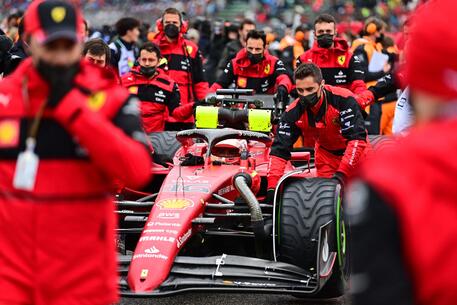Ferrari's Monegasque driver Charles Leclerc sits in his car as he is pushed by his team in the pits during the Emilia Romagna Formula One Grand Prix at the Autodromo Internazionale Enzo e Dino Ferrari race track in Imola, Italy, on April 24, 2022. (Photo by ANDREJ ISAKOVIC / AFP)