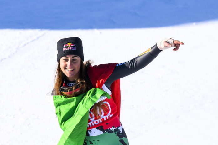 Una meravigliosa Sofia Goggia, con la mano sinistra rotta ed operata a Milano solo nel tardo pomeriggio di ieri, ha vinto la seconda discesa di coppa del mondo di St.Moritz in 1.28.85. (Ansa)