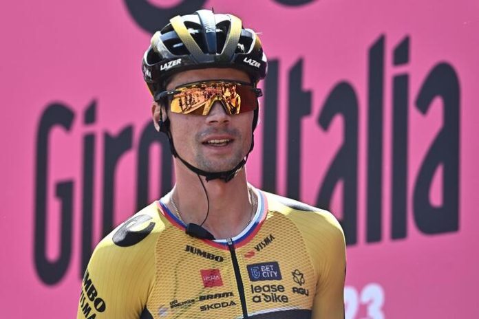 Slovenian rider Primoz Roglic of team Jumbo Visma on the signing in podium ahead the departure of the nineteenth stage of the 2023 Giro d'Italia cycling race over 183 km from Longarone to Tre Cime di Lavaredo, Italy, 26 May 2023. ANSA/LUCA