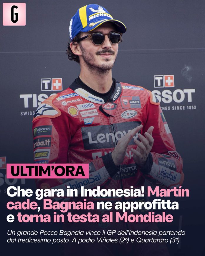 SPORT Grande Bagnaia vince in Indonesia da Luigi Cignoni, Direttore - 15 Ottobre 2023 0 466 Bagnaia strepitoso! Parte 13°, rimonta, vince e torna in testa al Mondiale